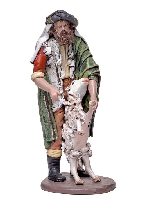 Pastor esquilando oveja en barro lienzado.